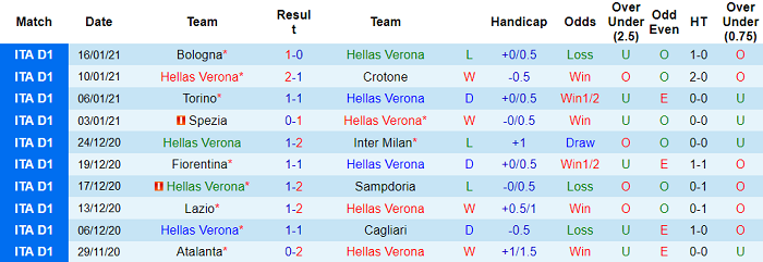 - Thống kê 10 trận gần nhất của Hellas Verona