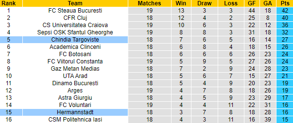 Nếu như Hermannstadt xếp áp chót thì Chindia Targoviste có mặt ở top 6 và lẽ dĩ nhiên là họ muốn duy trì vị thế đó. Song song với thứ hạng như vậy thì phong độ của đôi bên thời gian qua cũng có sự đối lập rất dễ nhận ra.