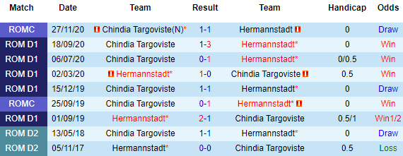 + Lịch sử đối đầu Hermannstadt vs Chindia Targoviste