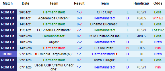 + Thống kê 10 trận gần nhất của Hermannstadt