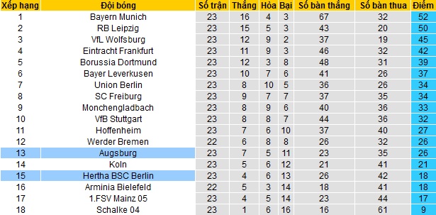 Trong khi đó Augsburg cũng chỉ đang đứng thứ 13 trên bảng xếp hạng. Tuy nhiên hiện tại Augsburg đang có được 26 điểm cũng sau 23 vòng đấu, hơn nhóm cầm đèn đỏ tới 8 điểm trong khi giải vẫn còn 11 vòng đấu nữa.