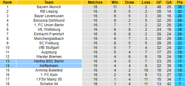Giai đoạn gần đây Hoffenheim cho thấy rõ dấu hiệu sa sút, 4 trận liên tiếp vừa qua họ thua 2, hòa 2 và toàn thua theo kèo châu Á. Lực lượng sứt mẻ với danh sách chấn thương lên tới 7 cầu thủ, Hoffenheim khó thi đấu khởi sắc trong tương lai gần. Trong khi đó Hertha Berlin lại đang cho thấy khả năng thi đấu tốt trên sân nhà, 3 trận tiếp khách gần đây họ bất bại với 2 thắng, 1 hòa.