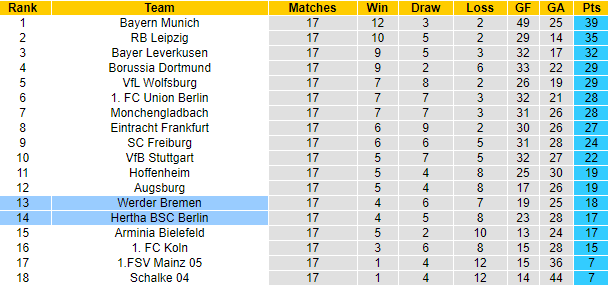 Cả Hertha Berlin và Werder Bremen đều chưa có được thành tích tốt tại giải VĐQG Đức mùa này. Sau 17 trận, Werder Bremen giành 18 điểm, xếp thứ 13 trên bảng xếp hạng. Trong khi đó Hertha Berlin có 17 điểm sau 17 trận, xếp sau đối thủ 1 bậc.
