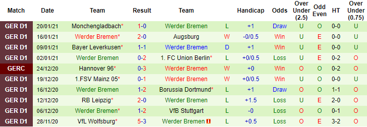 + Thống kê 10 trận gần nhất của Werder Bremen