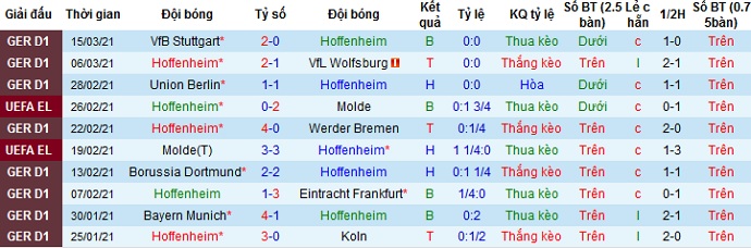 + Thống kê 10 trận gần nhất của Hoffenheim