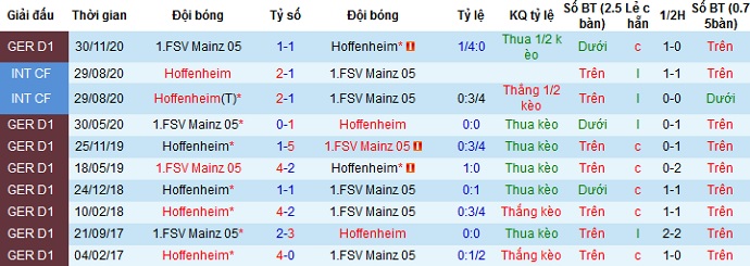 + Lịch sử đối đầu Hoffenheim vs Mainz 05