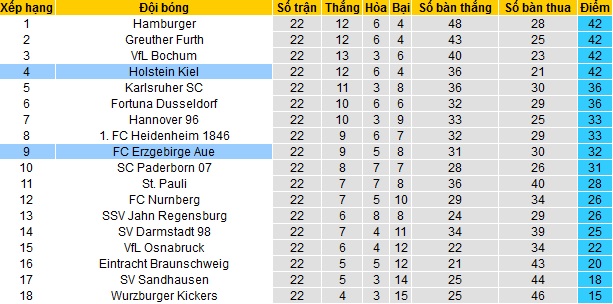 Trong khi đó Erzgebirge Aue hiện đang đứng giữa bảng xếp hạng ở vị trí thứ 9. Với 32 điểm sau 22 vòng đấu, Erzgebirge Aue đang có nhiều hơn nhóm các đội cầm đèn đỏ tới 12 điểm nhưng cũng kém các đội Top 4 tới 10 điểm.