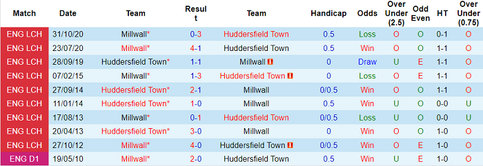 Millwall là một trong những đội có tỷ lệ thắng kèo thấp nhất Championship mùa này. Tỷ lệ thắng kèo của Millwall chỉ ở mức 34.78%, hơn mỗi Derby County (33.33%). Trong khi đó, tỷ lệ thắng kèo của Huddersfield ấn tượng hơn đáng kể: 45.83%.