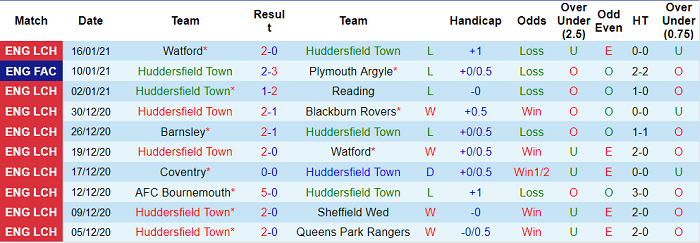 - Thống kê 10 trận gần nhất của Huddersfield