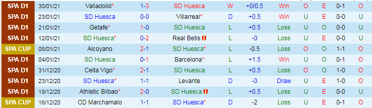 + Thống kê 10 trận gần nhất của Huesca
