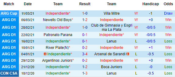 + Thống kê 10 trận gần nhất của Independiente
