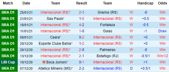 + Thống kê 10 trận gần nhất của Internacional