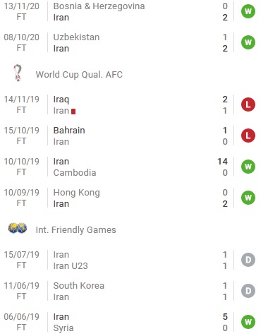 + Thống kê 10 trận gần nhất của Iran