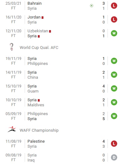 Trái lại Syria có thành tích khá tốt ở các trận đấu chính thức vào năm 2019. Thế nhưng cuối năm ngoái đến nay đội bóng đã thi đấu 3 trận giao hữu và kết quả không được khả quan khi chỉ thắng 1 và để thua 2. Mới đây nhất là trận thua của Syria trước Bahrain với tỷ số 1-3 cách đây ít ngày.