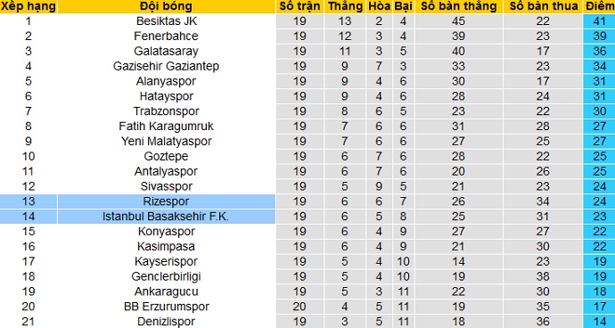 Bảng xếp hạng giải VĐQG Thổ Nhĩ Kỳ trước vòng 20