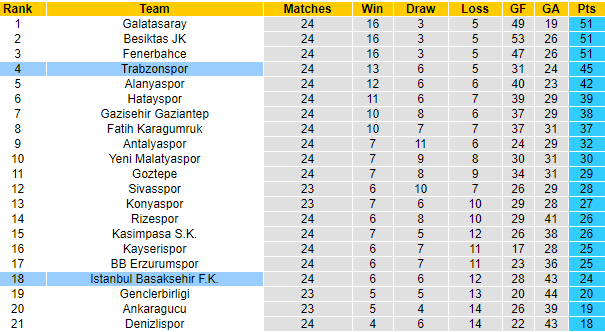 Là ĐKVĐ nhưng Istanbul Basaksehir lại chơi vô cùng tồi tệ ở mùa bóng này và đang phải đối diện với khả năng xuống hạng. Hiện tại họ đứng thứ 18 trên BXH, vị trí sẽ phải chia tay giải đấu với chỉ 24 điểm. Hy vọng thoát hiểm vẫn rộng mở với Istanbul Basaksehir bởi họ chỉ kém đối thủ xếp trên có 1 điểm.