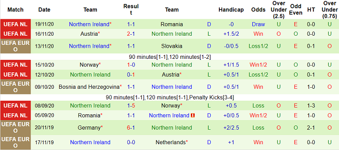 - Thống kê 10 trận gần nhất của Bắc Ireland