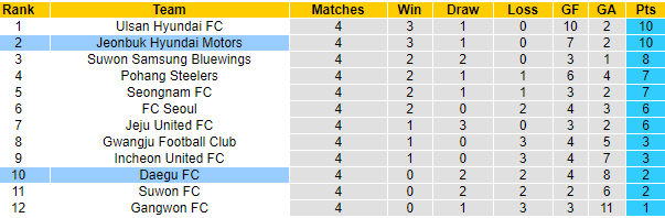 Trong khi đó, Daegu mùa này đang có phần sa sút. Sau 4 trận họ chỉ có 2 trận hòa cùng 2 thất bại. Với số điểm hiện có, Daegu sẽ còn nhiều việc phải làm nếu như muốn xuất hiện trong top 6 khi giai đoạn 1 này khép lại. Làm khách trước ĐKVĐ Jeonbuk, hy vọng giành điểm với Daegu là không nhiều.