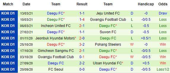 + Thống kê 10 trận gần nhất của Daegu