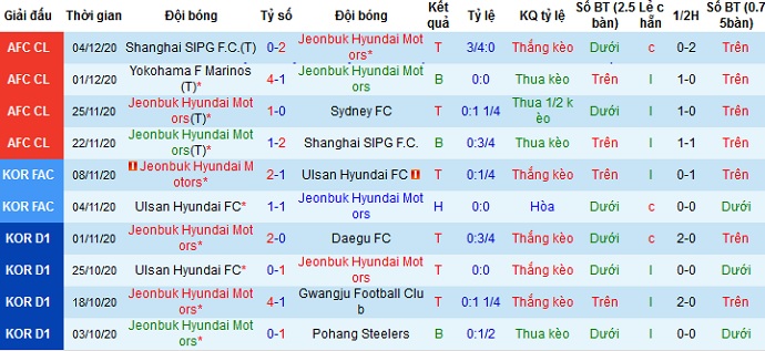 Nếu chỉ tính riêng tại K-League, ở 5 vòng đấu cuối cùng mùa giải trước Jeonbuk Hyundai thắng 4 và chỉ để thua 1. Trên sân nhà thành tích của đội bóng cũng khá tốt khi thắng 4 và để thua 1 trong 5 trận đấu gần nhất tại đây.