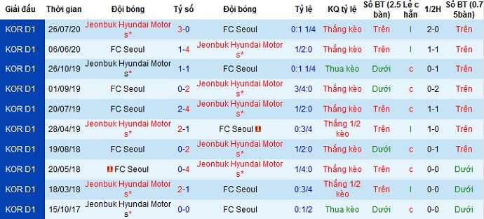 Trong 10 lần gặp nhau trước đó giữa hai đội, Jeonbuk Hyundai chiếm ưu thế gần như tuyệt đối với 8 trận thắng và 2 trận hòa. Ở cuối mùa giải trước FC Seoul cũng vẫn đang thi đấu khá tệ, thế nên chọn cửa trên ở trận đấu này là hoàn toàn có cơ sở và hợp lý.