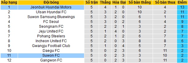 Thế nhưng hiện tại Suwon FC chỉ đang đứng áp chót bảng xếp hạng của K-League với 2 điểm có được sau 5 vòng đấu đầu tiên. Suwon FC đang có cùng bằng điểm với 2 đội bóng khác nhưng hơn kém về hiệu số bàn thắng và đang còn cách Top 6 tới 5 điểm. Trên sân khách Suwon FC mới có được 1 trận hòa trước khi để thua ở cả 2 trận gần đây.