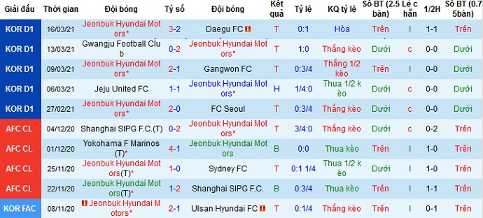 + Soi tỷ lệ kèo châu Á: Rõ ràng là Jeonbuk Hyundai thuộc về đẳng cấp khác so với đối thủ nên hoàn toàn dễ hiểu khi họ là đội bóng cửa trên với kèo chấp đang lên tới -1,25.