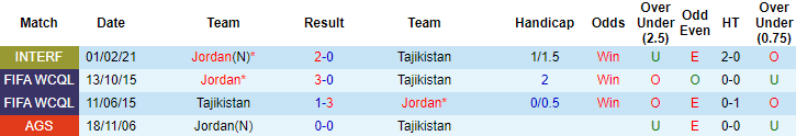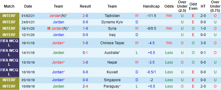 Trận giao hữu cách đây vài ngày (1/2/2021), Jordan đã dễ dàng giành chiến thắng với tỷ số 2-0 trước Tajikistan. Kết quả đó sớm được dự đoán khi lực lượng của Jordan được đánh giá vượt trội so với đối thủ. Jordan xếp hạng 95 trên BXH FIFA mới nhất với 1.244 điểm, trong khi đó Tajikistan xếp hạng 121 với 1.143 điểm.