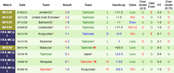 + Thống kê 10 trận gần nhất của Tajikistan
