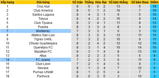 Trong khi đó Monterrey đang đứng thứ 7 trên bảng xếp hạng khi có được 12 đểm cũng sau 7 trận Hiện tại Monterrey kém các đội trong Top 4 là 3 điểm nhưng đang thi đấu ít hơn tới 2 trận.