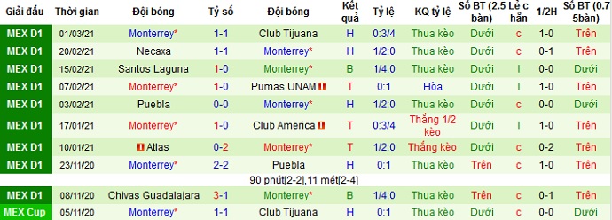 + Thống kê 10 trận gần nhất của Monterrey