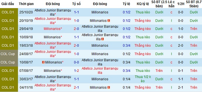 + Lịch sử đối đầu Junior Barranquilla vs Millonarios