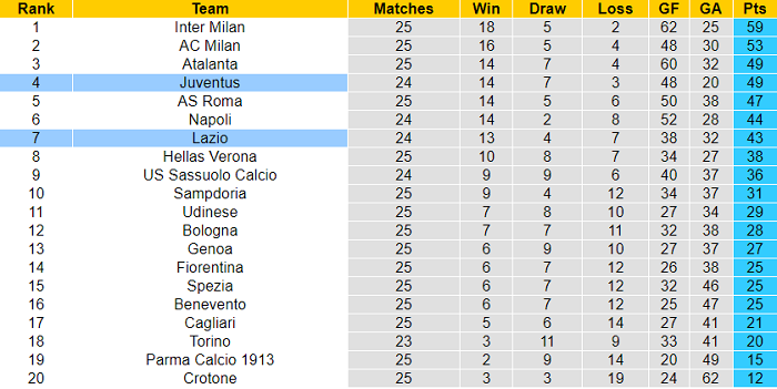 Cũng ‘may’ cho Juventus bởi họ được chạm trán Lazio vào thời điểm CLB này không có được phong độ tốt. Đại diện của thủ đô đã thua tới 2/3 trận vừa qua thuộc khuôn khổ Serie A. Trên mọi đấu trường, họ thua 3/4 trận gần nhất.