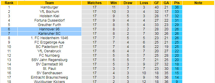 Trận đấu sớm vòng 18 giữa Karlsruher và Hannover là cặp đấu cân bằng khi cả hai cùng có được 26 điểm, lần lượt đứng ở các vị trí thứ 7 và 6 trên bảng tổng sắp giải hạng 2 Đức.