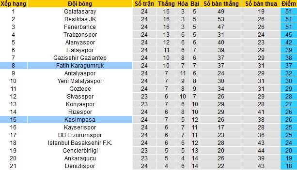 Trong khi đó Fatih Karagümrük mặc dù là tân binh của giải đấu nhưng hiện đang đứng thứ 8 trên bảng xếp hạng với 37 điểm cũng sau 24 vòng đấu. Tuy nhiên khoảng cách của đội bóng đến nhóm các đội có suất dự cúp châu Âu cũng đang lên tới 11 điểm.