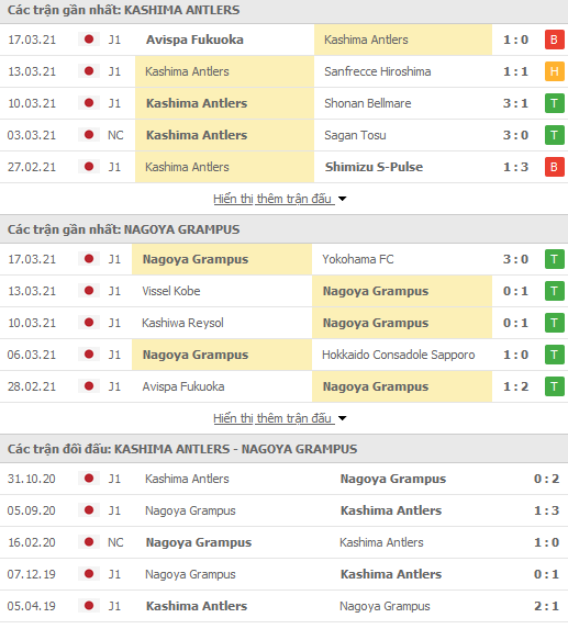 Phong độ và thống kê đối đầu gần đây Kashima Antlers vs Nagoya Grampus: