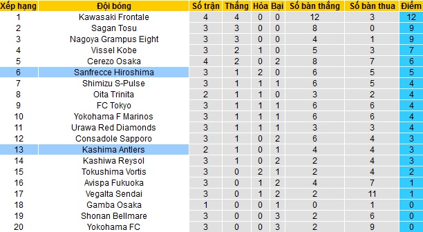 Bảng xếp hạng J-League vòng 4
