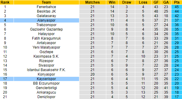 Ngày hôm nay họ đón tiếp Alanyaspor trên sân nhà, đối thủ vô cùng khó chơi. Vào thời điểm này, Alanyaspor đang có mặt ở vị trí thứ 4 và khát điểm để giữ vững thứ hạng của mình. Cần biết rằng Alanyaspor chỉ hơn đối thủ phía sau 1 điểm, và nếu sảy chân họ hoàn toàn có thể văng khỏi top dự Cúp châu Âu.
