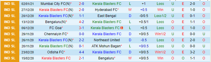 + Thống kê 10 trận gần nhất của Kerala Blasters
