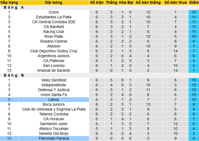 Bảng xếp hạng giải VĐQG Argentina trước vòng 7