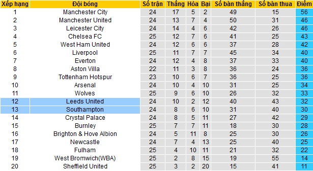 Cả Leeds United và Southampton hiện giờ đều chỉ đang đứng ở nửa dưới bảng xếp hạng của giải ngoại hạng Anh. Trong khi Leeds United đứng ở vị trí thứ 12 với 32 điểm sau 24 vòng đấu thì Southampton đứng ngay dưới ở vị trí thứ 13 với 2 điểm ít hơn.
