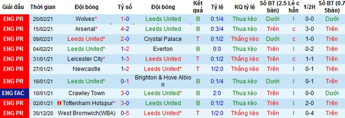 + Thống kê 10 trận gần nhất của Leeds United