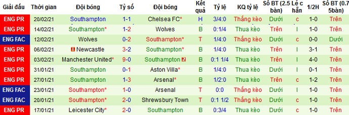 + Thống kê 10 trận gần nhất của Southampton