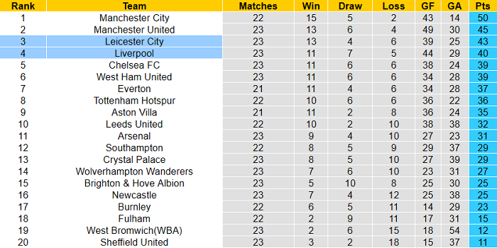 Bảng xếp hạng Ngoại hạng Anh 2020/21 mới nhất