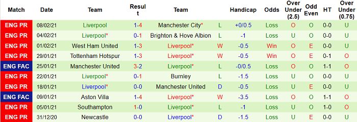- Thống kê 10 trận gần nhất của Liverpool