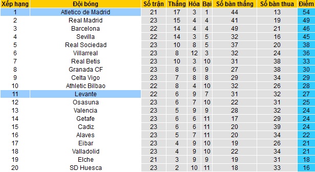 Bảng xếp hạng La Liga vòng 23