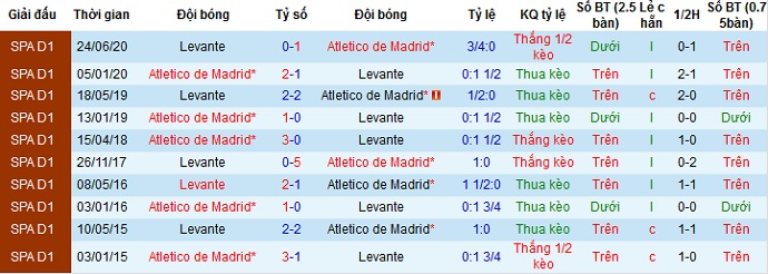 + Lịch sử đối đầu Levante vs Atletico Madrid