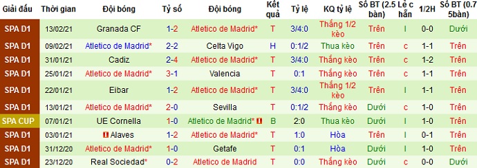 + Thống kê 10 trận gần nhất của Atletico Madrid