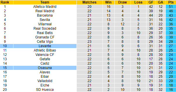 Đôi bên là những cái tên trung bình yếu ở La Liga, và cả 2 cũng chỉ đặt mục tiêu trụ hạng. Tính đến thời điểm hiện tại thì 2 đội đều đang có thứ hạng an toàn. Levante đứng thứ 10 còn Osasuna xếp thứ 15 và kém đối thủ 5 điểm.