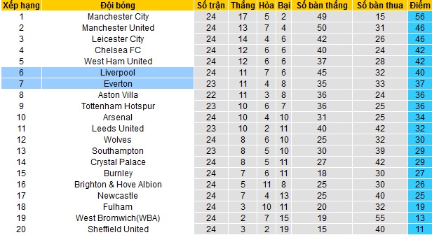 Thế nhưng hiện tại hai đội lại đang đứng sát nhau trên bảng xếp hạng. Trong khi Liverpool đã tụt xuống vị trí thứ 5 với 40 điểm sau 24 vòng đấu thì Everton đứng ngay sau ở vị trí thứ 6 với 37 điểm nhưng thi đấu ít hơn 1 trận.